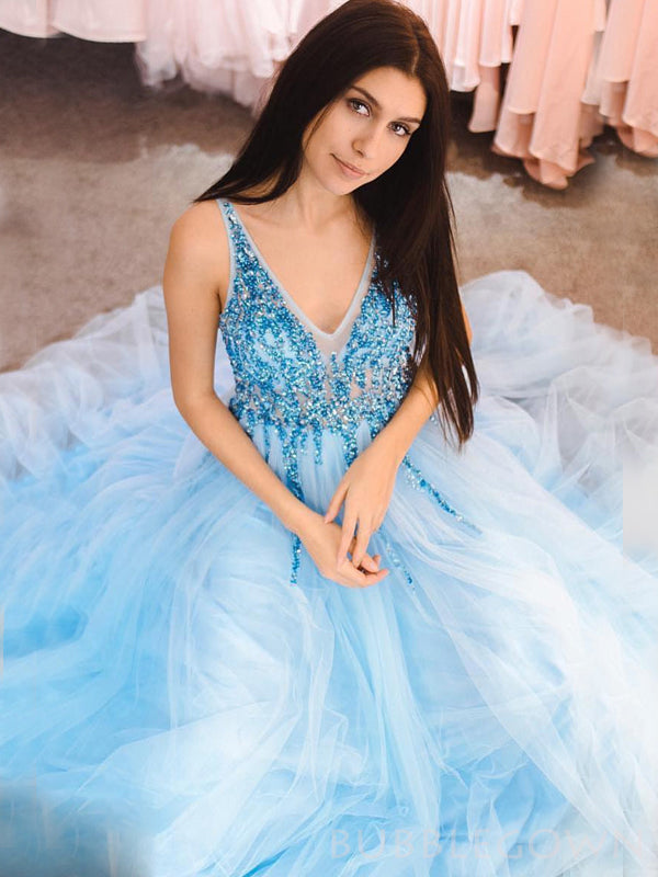 A-lin Blue Tulle Beaded V-neck Long Evening Prom Dresses, Custom Prom Dress, BGS0121
