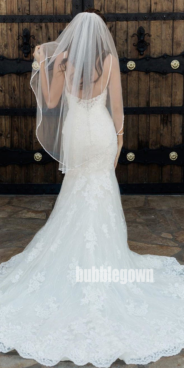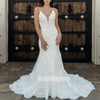Elegant V-neck Spaghetti Strap Mermaid Lace White Long Wedding Dresses, BGH016