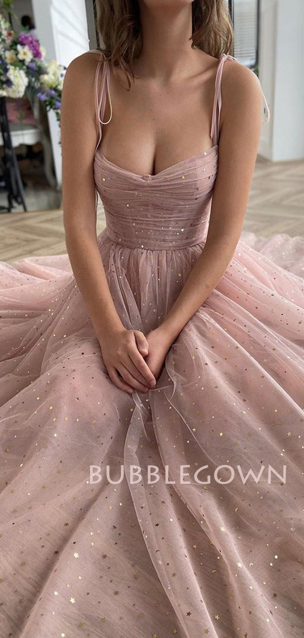 Spaghetti Straps Pink Sharkly Long Evening Prom Dresses, Cheap Custom Homecoming Dresses, MR7287