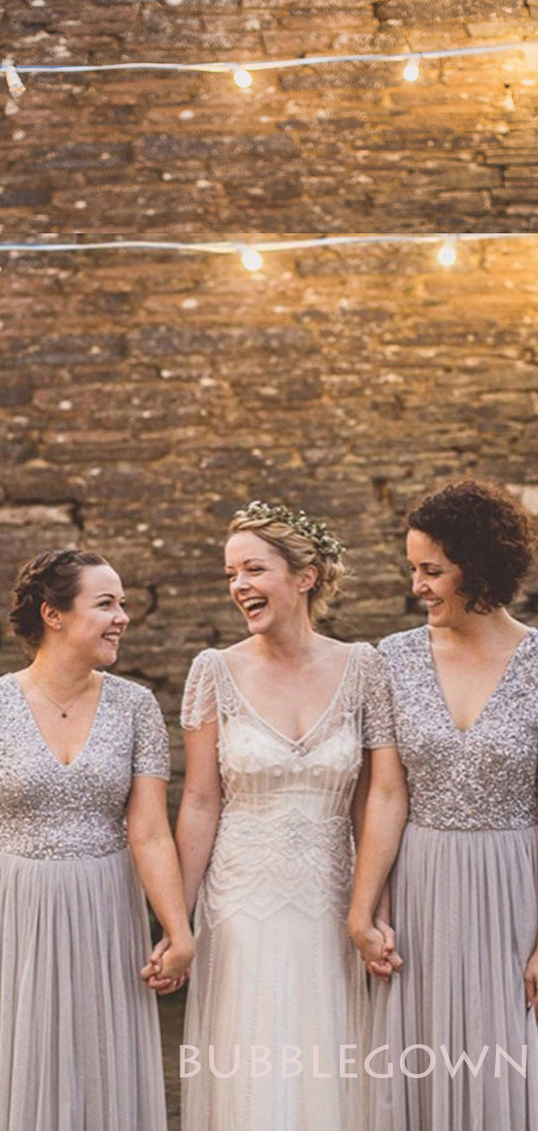 Column Short Sleeves Grey Tulle Long Bridesmaid Dresses , BN1025 Column Short Sleeves Grey Tulle Long Bridesmaid Dresses , BN1025
