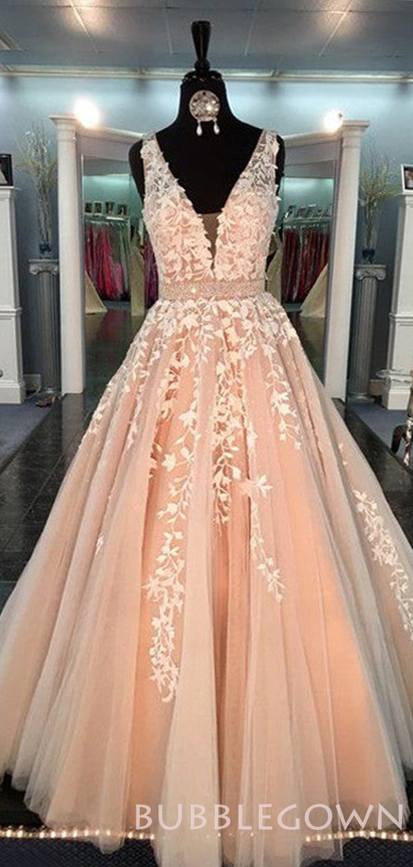 Affordable Peach V Neck Applique Long Cheap Prom Dress, BG51486 Affordable Peach V Neck Applique Long Cheap Prom Dress, BG51486