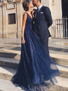 A-line Navy Blue Tulle Sparkly Long Evening Prom Dresses, V Neck Custom Prom Dresses, MR8236 A-line Navy Blue Tulle Sparkly Long Evening Prom Dresses, V Neck Custom Prom Dresses, MR8236