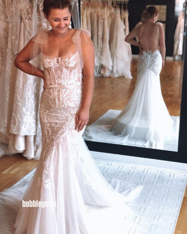 Elegant Spaghetti Strap Lace Mermaid Wedding Dresses, BGH084 Elegant Spaghetti Strap Lace Mermaid Wedding Dresses, BGH084