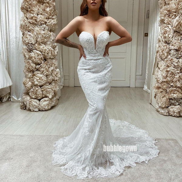 Sweetheart White Lace Applique Mermaid Wedding Dresses, BGH097