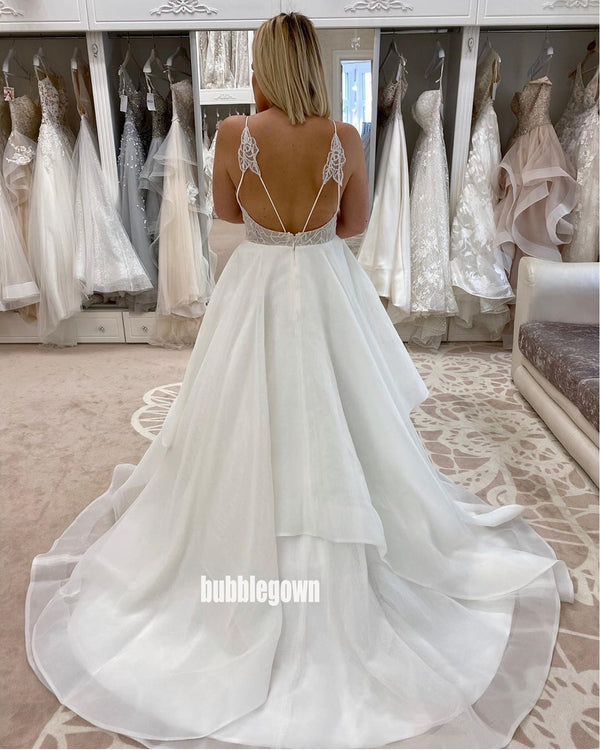 Unique Spaghetti Strap Open-back Organza Long Wedding Dresses, BGH066